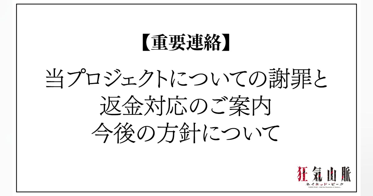 【※重要連絡】当プロジェクトについての謝罪と、返金対応のご案内、今後の方針について by 映画「狂気山脈 ネイキッド・ピーク」本編制作プロジェクト
