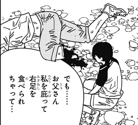 今回はアサと母の過去が描かれ回想の中で父が左足を悪魔に食われてたんですが、台詞では右足になっていました。