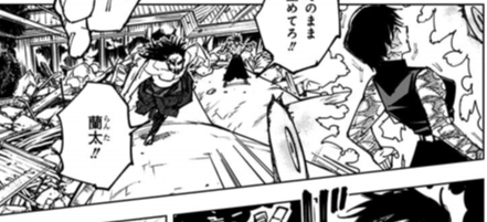 原作では蘭太が真希の動きを止めている間に甚壱が走って行き、蘭太の目が潰されて甚壱が一瞬振り返るも「構うな!」と言われ真希を攻撃するというシーンでした。(ちなみにジャンプ本誌だとこの話は下書きだった)