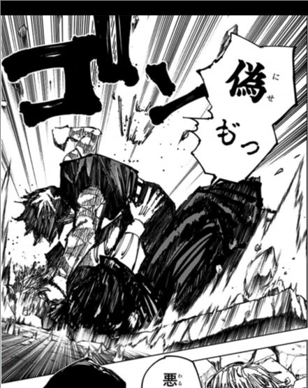 ギャグみたいなくどい見せ方をしてるのが酷いというのは大前提として、原作では直前に亜音速バトルの中で一瞬時が止まって真希が投射呪法のタネを解説しパンチで再び時が動き出すというシーンだったのに、しつこい4カメとレントゲンのせいで止まった時からの解放感も失われていました。