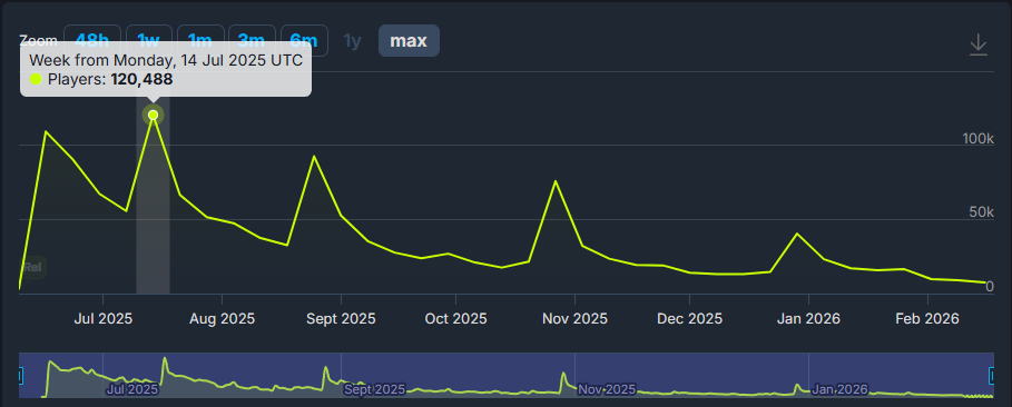 サービス開始当初12万あったsteamの同接は1万未満に激減し、セルランも190位台まで落ちていました。